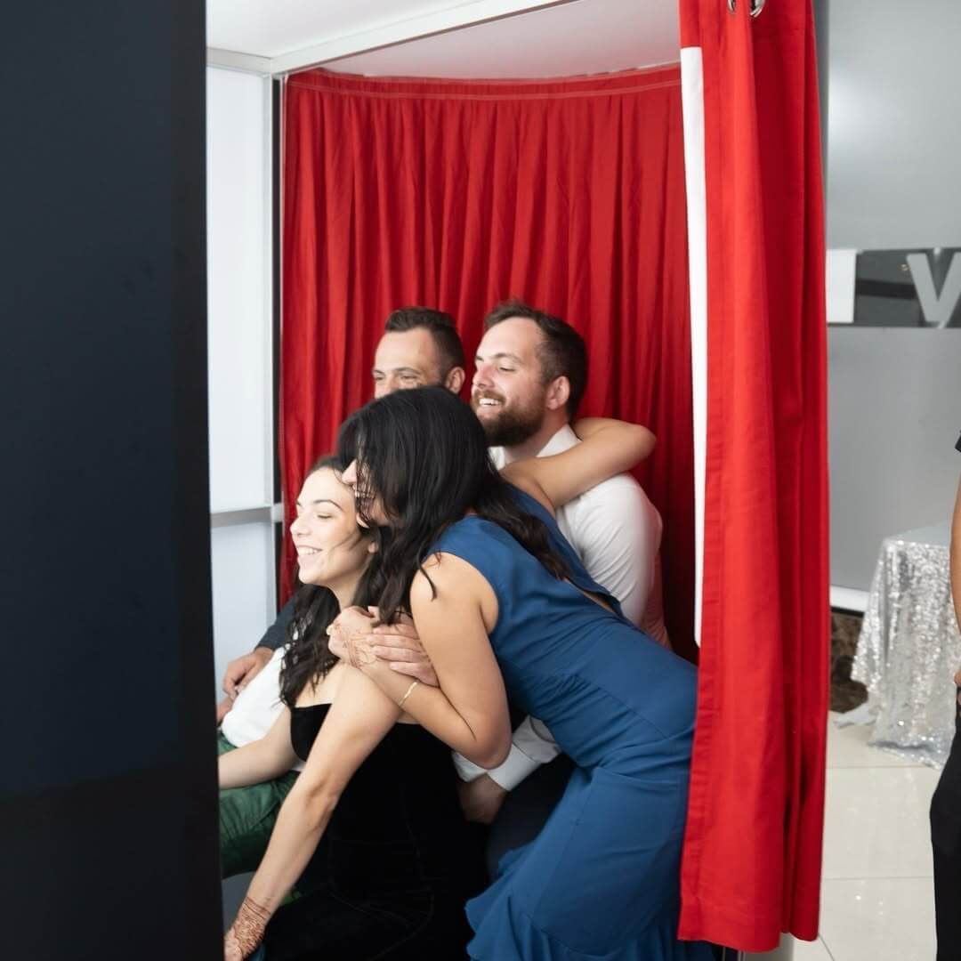 One of the biggest differences with an enclosed photo booth is how it changes behavior. When guests step inside and the space closes off from the rest of the event, the atmosphere becomes more relaxed. People aren’t being watched, and that leads to more natural expressions.